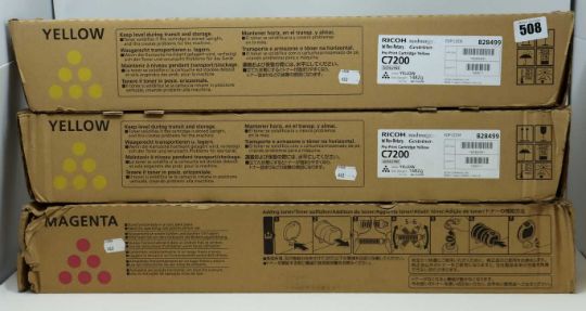 Three as new Ricoh Pro Print Cartridges C7200; 2 x Yellow, 1 x Magenta (Cartridges sealed, damage to boxes).