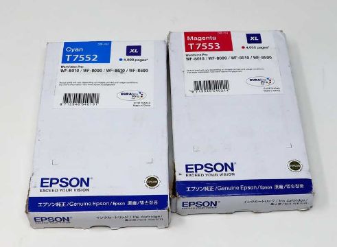 Two boxed as-new Epson Original Ink Cartridges. 1x T7552 XL C13T755240 Cyan, 1x T7553 XL C13T755340 Magenta. Boxes damaged, plastic packaging sealed.