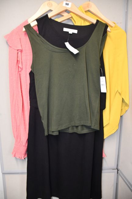 One as new Loft Clip Dot Smocked Ruffle Blouse in Chalk Rose size M. One as new Loft Smocked Trim Shell size M. One as new Loft Women's Black Scalloped Wrap Back Ponte Dress size 10.