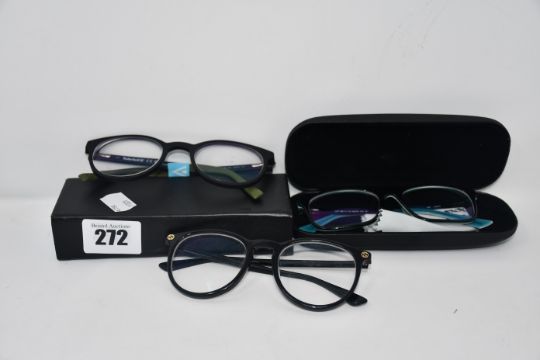 Four pairs of glasses to include: One pre-owned Timberland prescription glasses (TB1584-002). One pre-owned Gucci Havana prescription glasses (GG0027O. no box). One pre-owned BE happy prescription glasses.