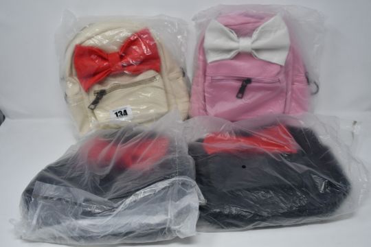 Two as new The Bow Mini Backpack black with red bow. One as new The Bow Mini Backpack white with red bow. One as new The Bow Mini Backpack pink with white bow.