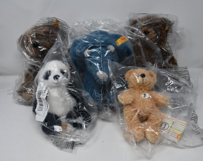 Two as new Steiff Teddies Terry braun meliert , one small as new Steif teddy fynn beigh bear, one as new steiff Dixi Triceratops dinosaur petro and one as new Steif ming panda.