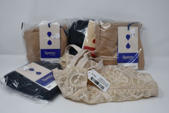 Two as new Speax by Thinx absorbent underwear for bladder leak protection (Colour: nude. Size: 5XL). One as new Speax by Thinx absorbent underwear for bladder leak protection (Colour: black. Size: 5XL). One as new Thinx Hi-Waist size L. One as new Myself_Lingerie Edith Lances Lace Wire-Free Minimizer Longline colour: champagne. Size: 36C (10116).