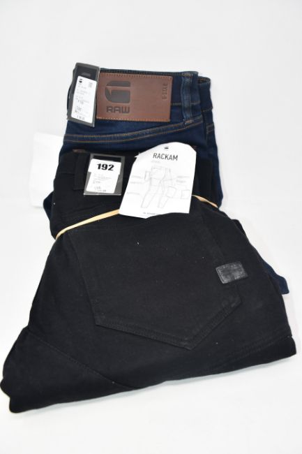 One as new G Raw women knee deep high skinny jeans (Colour: worn in tidal cobler. Size 28/30. Model: 5622). One as new G Raw Rackam 3D skinny jeans (Colour: pitch black. Size 28/30). One as new G Raw slim jeans (Colour: dark aged. Size 28/30. Model: 3301. Security tag attached).