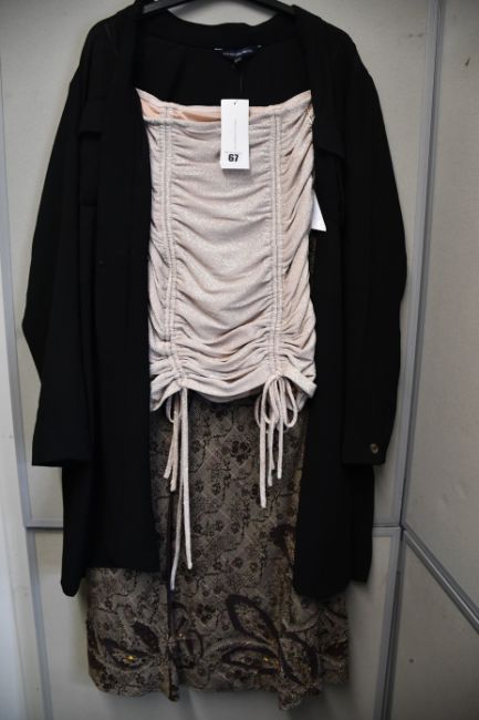 One as new French Connection Colet Wrap Tuxedo dress size 16. One as new M&S brown dress size 12. One as new Love Triangle high light skirt size S.