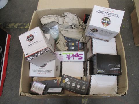 A large quantity of boxed as new tattoo equipment to include Barber DTS seamless tattoo tubes with silicone grip (15 pack), Envy EO gas sterile tattoo needles and Select Black single blade stainless steel razors.