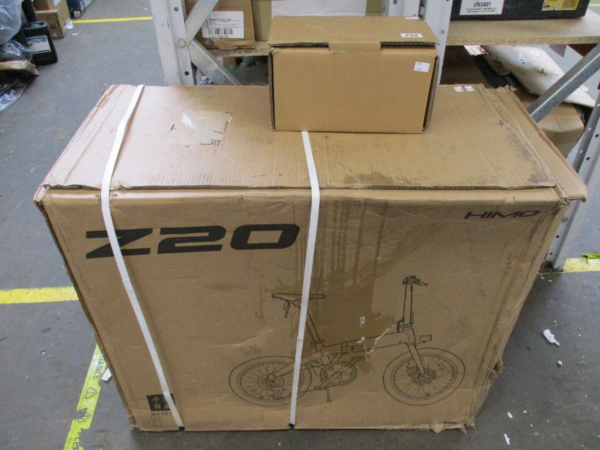 A boxed Himo Z20 folding electric bicycle in white with a box of additional accessories (Some damage to box).