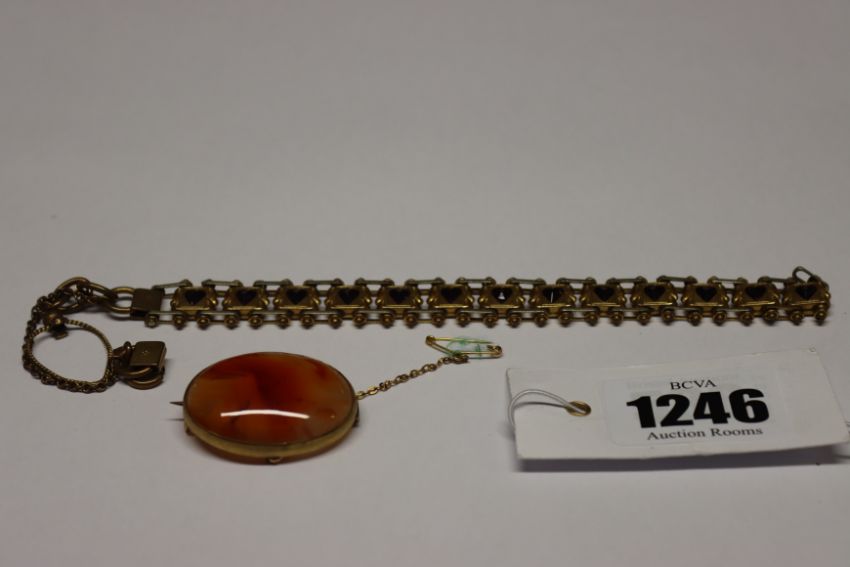 A hard stone agate oval pendant in yellow metal mount together with a yellow metal bracelet.