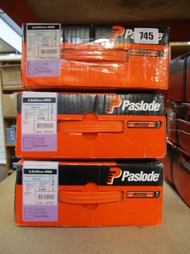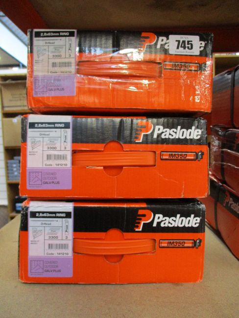 Three Paslode 141210 IM350 2.8mm x 63mm Galv Nails x 3300 with 3 fuel cells (Some damage to boxes).