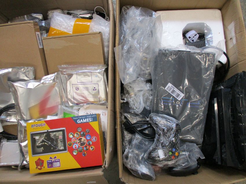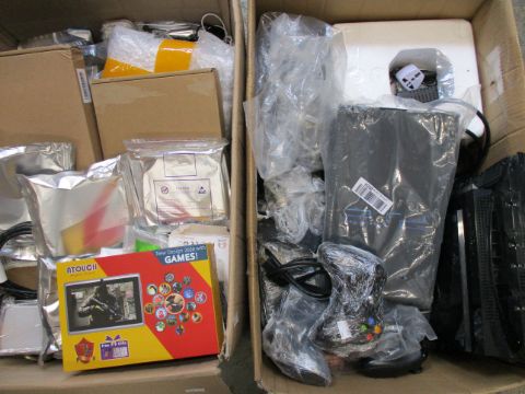 Two boxes of assorted new and pre-owed small electrical items and accessories.