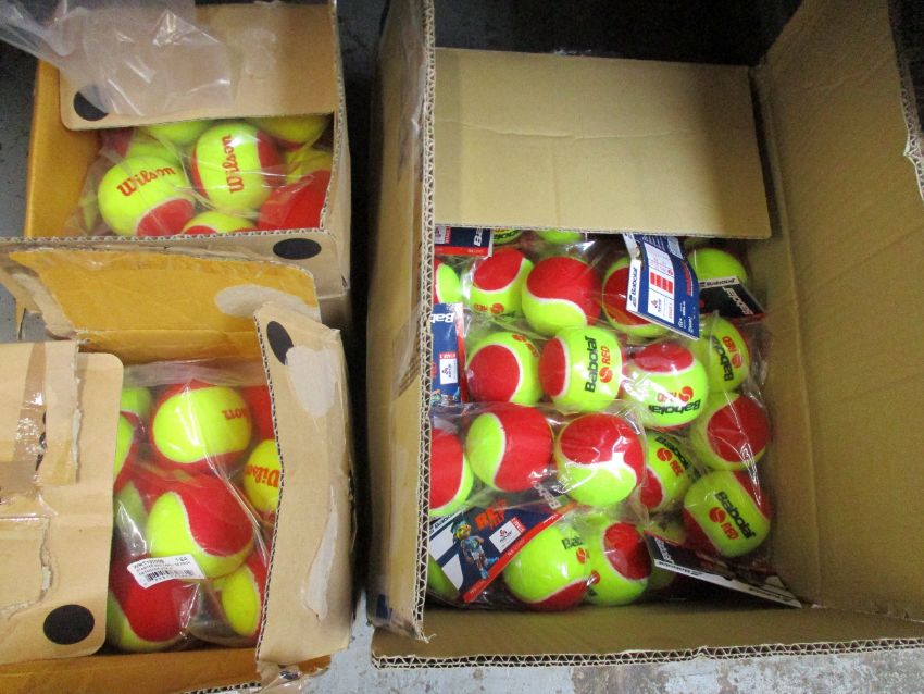 A quantity Tennis balls to include Babolat red felt training balls (Approximately 22 packs of 3 balls) and seventy two Wilson Starter red training balls.