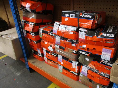 A large quantity of assorted as new Paslode (and similar) nails with fuel packs to include codes: 141227, 141185, 141208 and 141234 (Approximately 20 packs, some damaged).