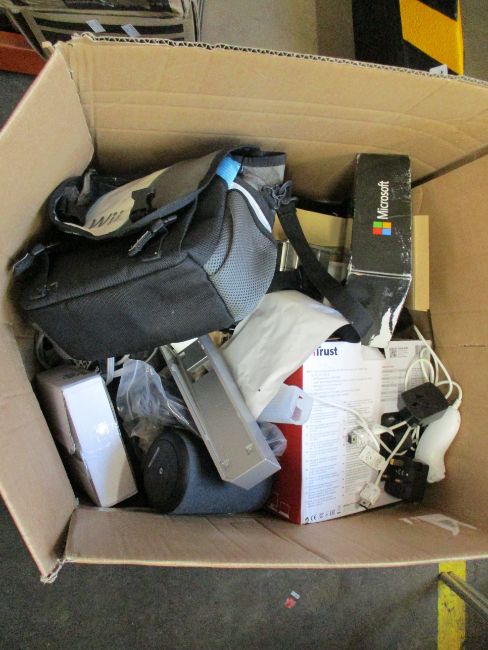A box of assorted as new and pre-owned small electrical items and accessories.