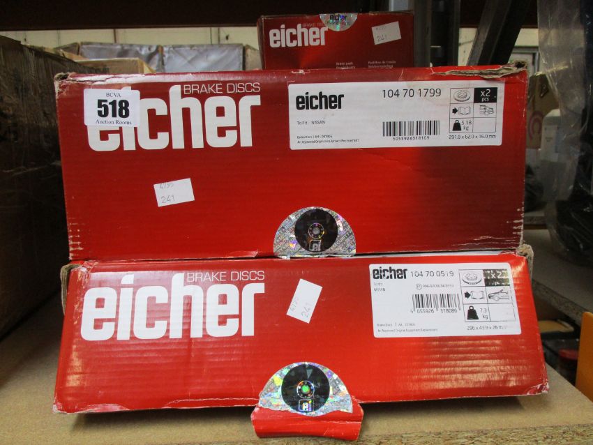 Three boxed as new Eicher carp part and related items to include two boxed of Eicher brake discs and one boxed Eicher brake pads.