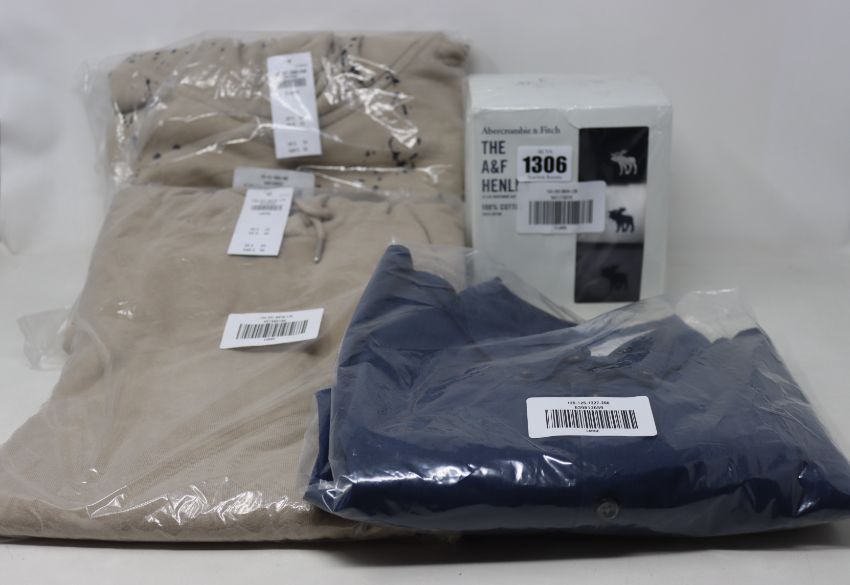 As new Abercrombie & Fitch clothing; The A&F Henley 3-pack of T-shirts (XL), navy shirt (L), hoodie (L) and paint splatter hoodie (XL).