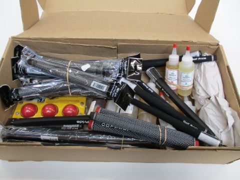 One box containing a quantity of as new miscellaneous golfing accessories to include twelve men's Winn Dri-Tac oversize grips, one Ball of Steel (3-Pack) and Pro Fix Quick/Long Cure A/B 4/8fl oz (Approximately 30 items).