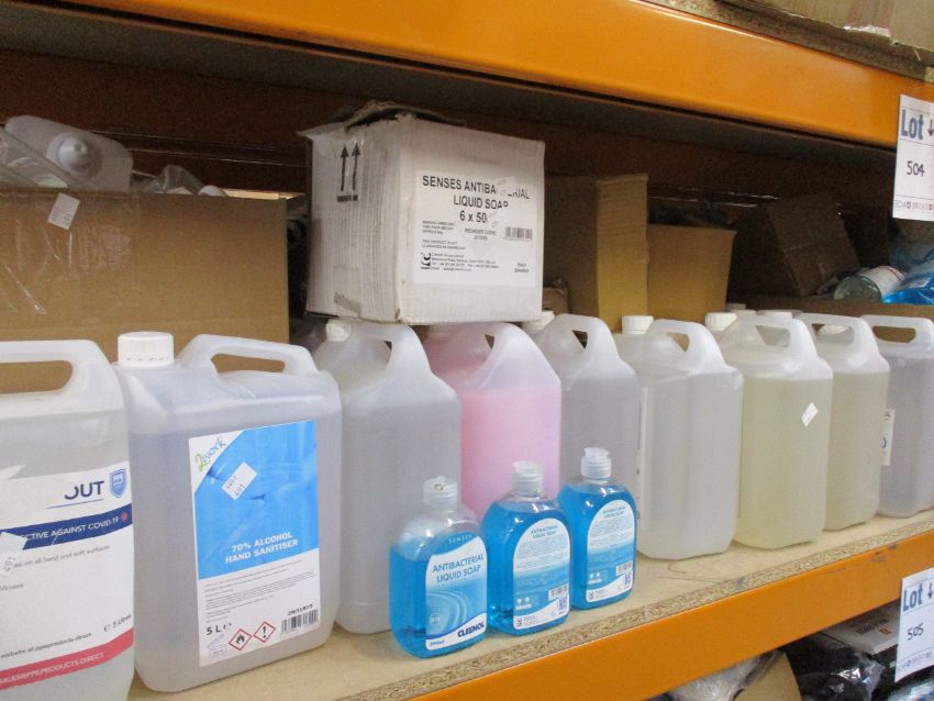 Two shelves of assorted hand sanitizers/soaps and related items.
