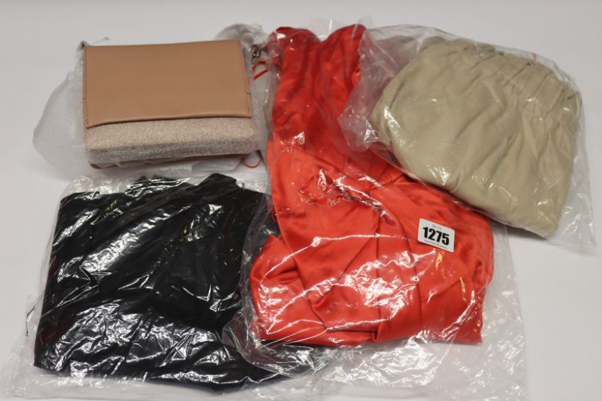 One women's as new Express Super High Waisted Linen-Blend Button Front Shorts size M (03015107). One women's as new Express High Waisted Patch Pocket Pencil Skirt size 10 (07668855). One women's as new Express Satin V-Neck Asymmetrical Midi Dress size M (07924868). One as new All Saints Brune Leather Shoulder Bag (WB023S).