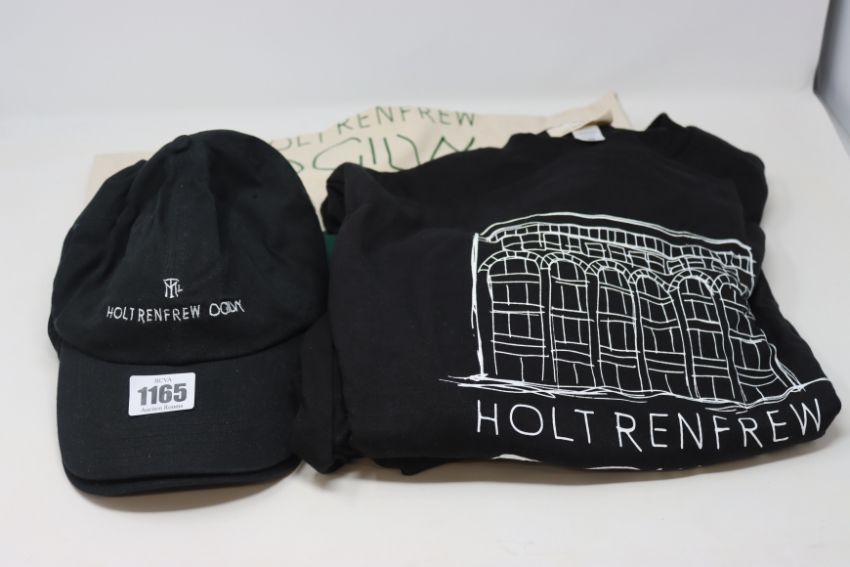 One as new Artgang Montreal Heritage natural and green tote Bag. Two as new Artgang Montreal Heritage x Holt Renfrew Ogilvy black long sleeve shirt size M (no tags). Two as new Artgang Montreal Holt Renfrew Ogilvy cap (no tags).