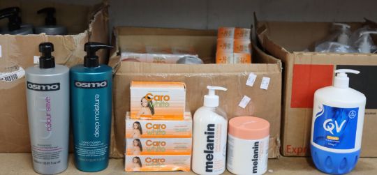 A quantity of Osmo 1000ml conditioners/shampoo, a quantity of Cara White beauty cream/soaps and a quantity of QV cream.