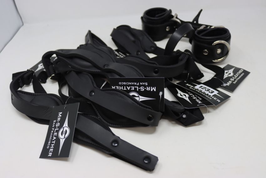 Six as new MR-S-Leather neoprene padded blindfolds (RRP $39 each) and a MR-S-Leather leather wrist to ball restraint (RRP $140).