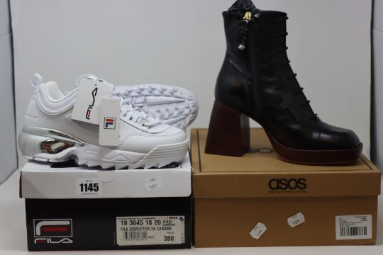 A pair of ASOS Robyn Premium leather platform boots in black (UK 5), a pair of Fila Disruptor 2A Chrome (UK5) trainers.