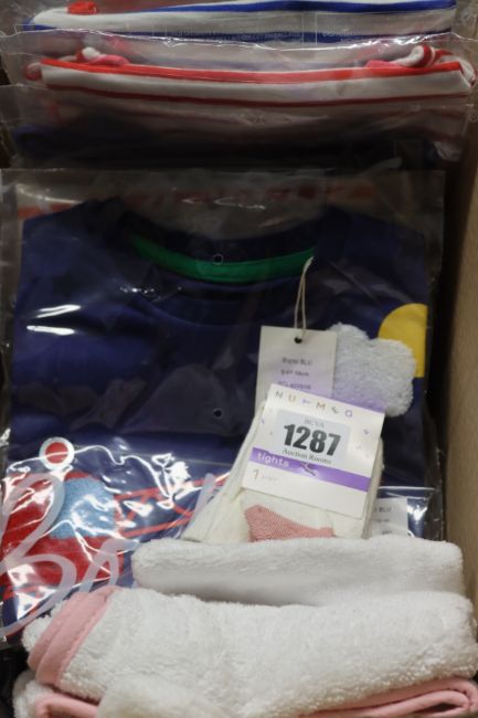 A quantity of baby's and children's as new clothing to include: Lily & Dan hooded baby towel and wash mitt, Little Nutmeg animals print shirt and denim overall size 3-6 months, Little Nutmeg 3 pack long sleeve shirts (No tags), Boden blue shirt size 2-3y, Boden striped shirt size 2-3y, Boden guinea pig shirt and trousers size 6 y, Boden yellow shirt size 5-6y, Boden unicorn shirt size 5-6y, Boden camping shirt size 5-6y, Boden crane shirt size 5-6y, Boden striped shirt size 5-6y and Boden blue shirt size 5-6y.