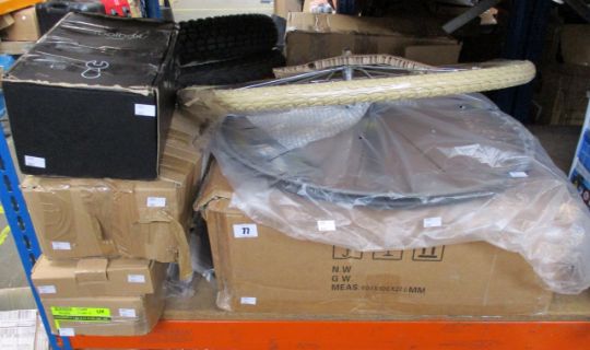 A collection of assorted electric bike components to include: eBike conversion electronics and battery, bicycle wheels and other related items.