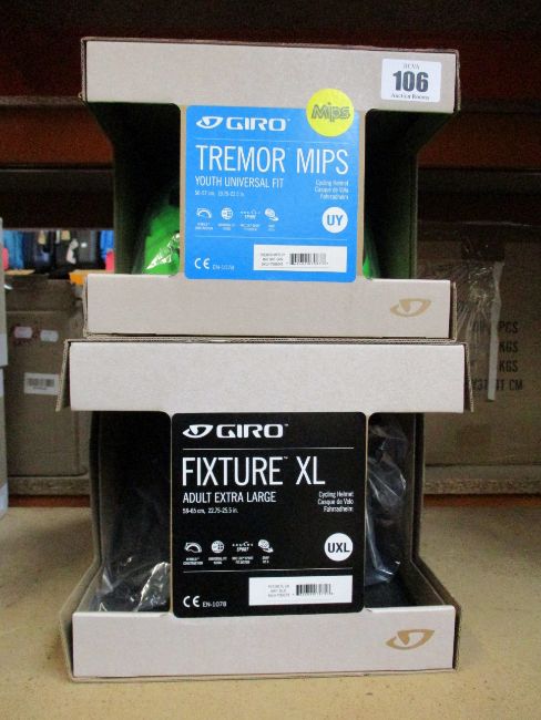 Two boxed as new Giro bicycle helmets to include: one Tremor MIPS helmet (Size: Youth Universal) and one Fixture XL helmet (Size: Adult Extra Large).