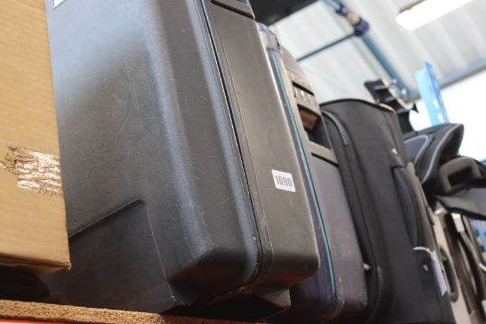 five empty suitcases/holdalls and a storage box.