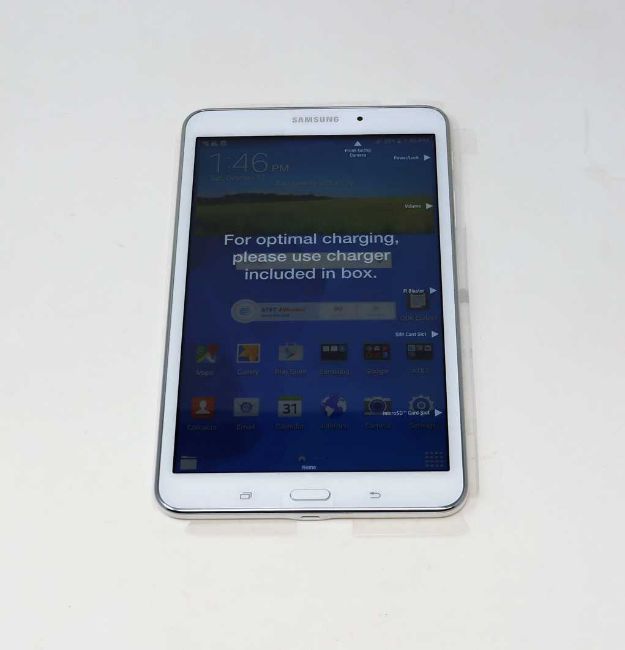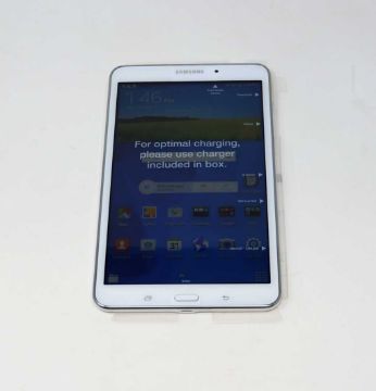 A boxed as new Samsung Galaxy Tab 4 SM-T337A AT&T 4G 16GB 8" Tablet in White (box opened, cosmetic damage to box) (UK plug adaptor required).