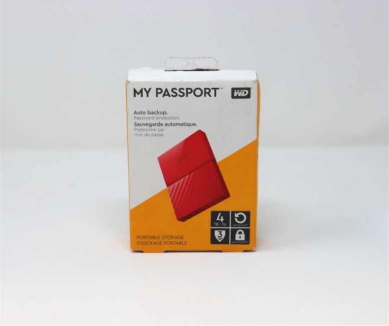 A boxed as-new WD My Passport 4TB Auto Backup Portable Hard Drive in Red (box sealed).