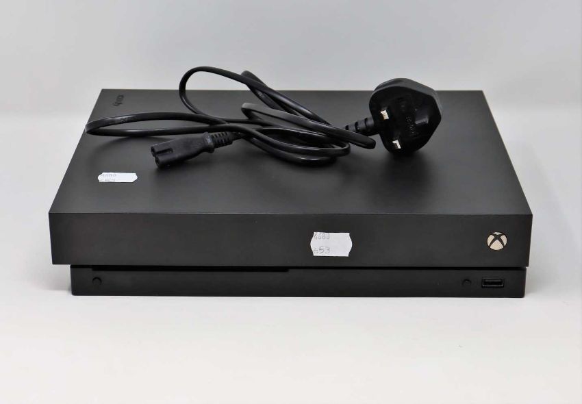 A pre-owned Xbox One X 1TB in Black (Model No: 1878) with adapter (no controllers or other accessories) (Powers on, not further tested).