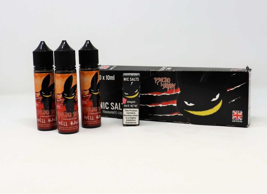 A carton of Physco Bunny Blue Retro 20mg Nic Salts (10 x 10ml, some packaging damaged, best before 06/24) and three bottles of Well Baked 50ml Short Fill Zero Nicotine Flavoured E-Liquid. (Over 18's Only).