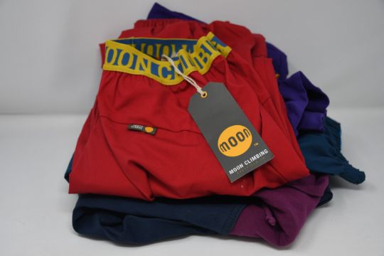 Five pairs of assorted as new Moon Climbing rock climbing trousers (Four pairs without tags but as new).