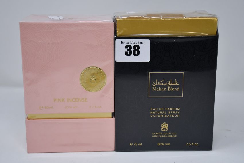 Two boxed as new Abdul Samad Al Qurashi eau de parfum to include one Abdul Samad Al Qurashi eau de parfum Pink Incense (80ml) and one Abdul Samad Al Qurashi Makan Blend eau de parfum (75ml).