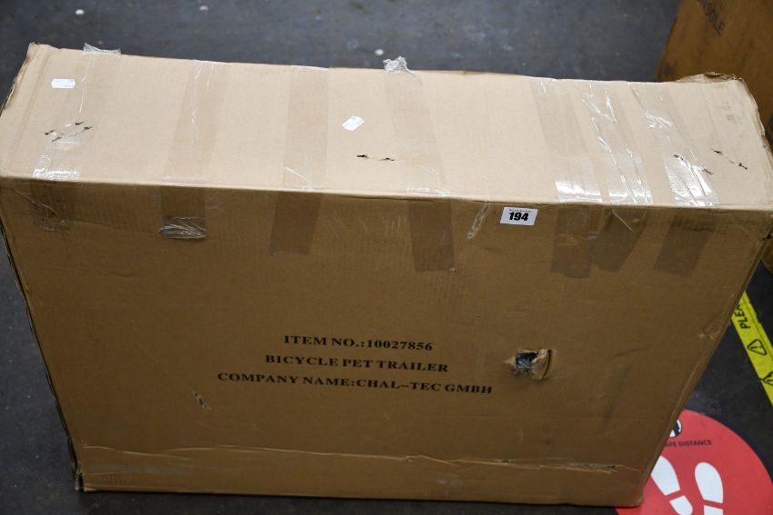 One boxed as new Chal-Tec GMBH bicycle pet trailer (Item Number: 10027856).