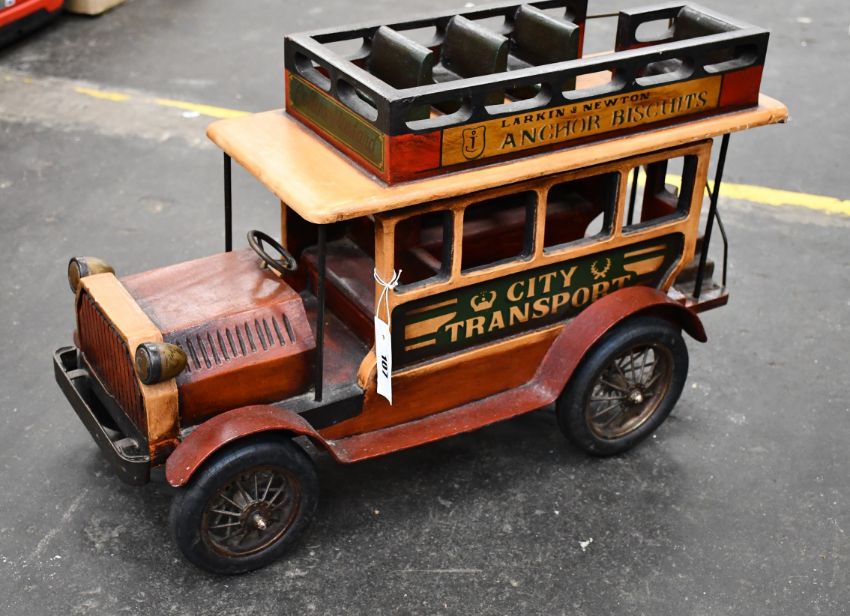 A wooden and metal vintage toy advertising truck. Advertising Irish Whisky and biscuits, 66cm x 42cm.