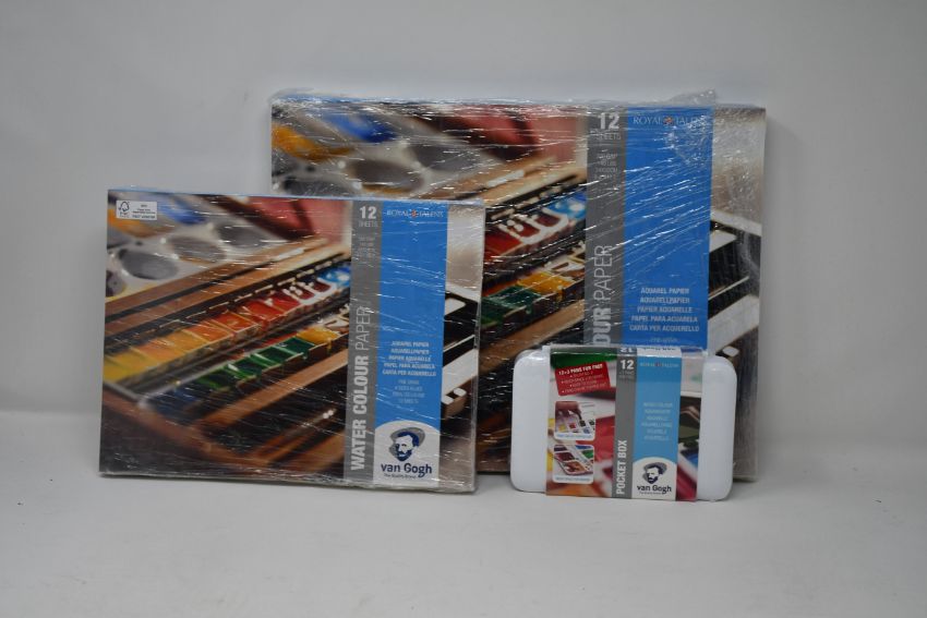 A quantity of Van Gogh watercolour paper by Royal Talens; Nine pads of twelve sheets 24x32cm and six pads of twelve sheets 18x24cm, along with three Van Gogh watercolour pocket boxes (12 + 3 pans for free).