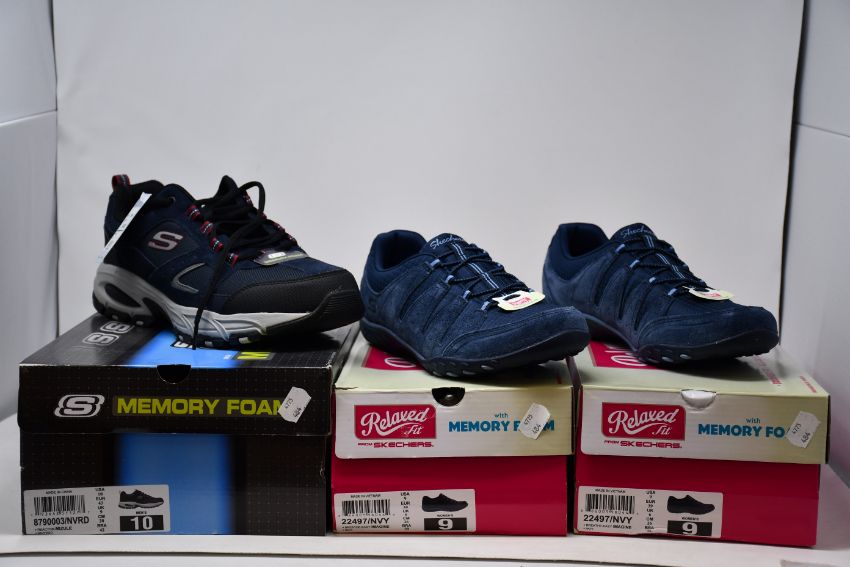Three pairs of as new Skechers footwear; two pairs of Breathe Easy Imagine (UK 6) and a pair of Reactor-Mzule (UK 9).