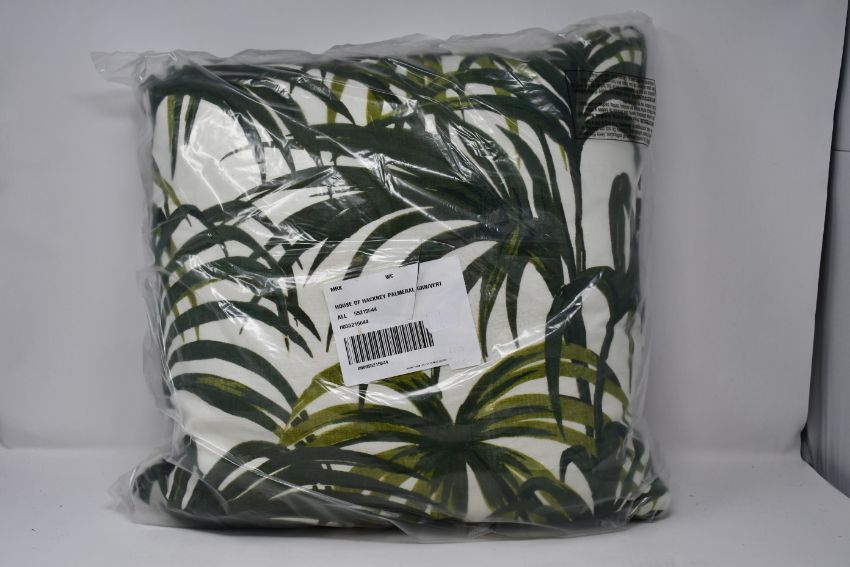 Two as new House Of Hackney Palmeral medium cotton-linen cushions in off white and green.