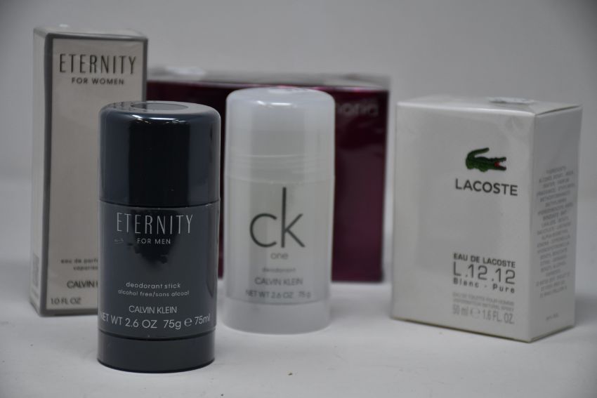 A Calvin Klein Euphoria eau de parfum (50ml), Lacoste L.12.12 Blanc -Pure eau de toilette (50ml), Calvin Klein Eternity eau de perfum (30ml), Calvin Klein Eternity deodorant stick (75ml) and a Calvin Klein One deodorant stick (75g).