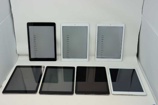 SOLD FOR PARTS ONLY: Three pre-owned Apple iPad Air (Wi-Fi only) A1474 in Space Grey (one with small inscription and cosmetic scratches to back casing), two pre-owned Apple iPad Air (Wi-Fi only) A1474 in Silver (one with damaged screen glass), a pre-owned Apple iPad Air (Wi-Fi/Cellular) A1475 in Space Grey (Small inscription to back casing) and a pre-owned Apple iPad Air (Wi-Fi/Cellular) A1475 in Silver (All iCloud activation locked, sold for parts only).