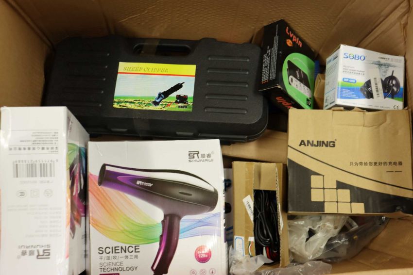 A box of assorted as new small electrical items and accessories.