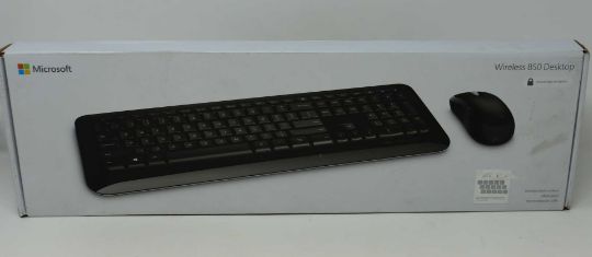 A boxed as new Microsoft 850Wireless Keyboard and Mouse Desktop Combo in Black (Model: PY9-00019) (Box sealed, damage to box).