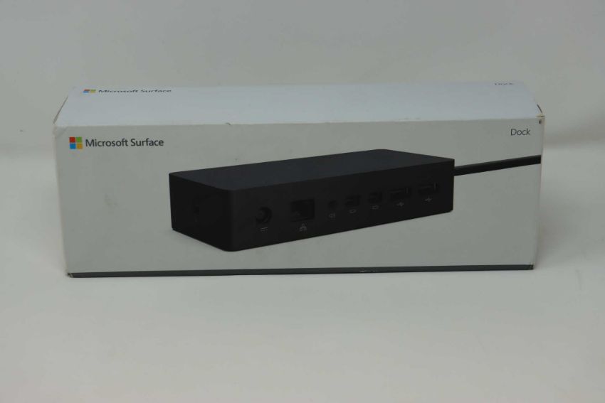 A boxed as new Microsoft Surface Dock (2x HD Video ports, Gigabit Ethernet port, 4 x USB 3.0 ports, Audio port) (Box sealed, some cosmetic damage to box).