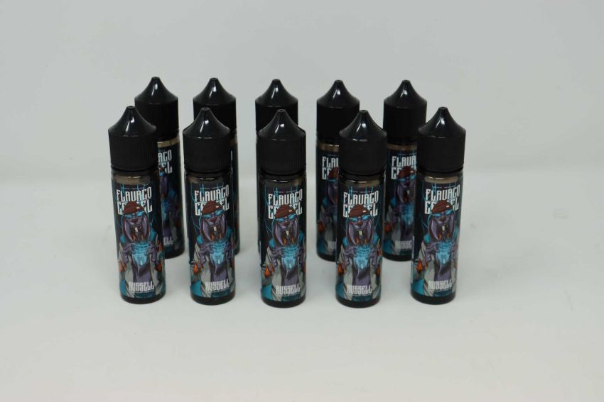 Ten bottles of FlavaCo Cartel Russell Blackcurrent and Pineapple 50ml Shortfill Zero Nicotine E-liquid.