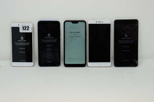 SOLD FOR PARTS: Five pre-owned Xiaomi smartphones (all FRP locked, some with damaged screen glass and/or other cosmetic damage. Sold for parts only).