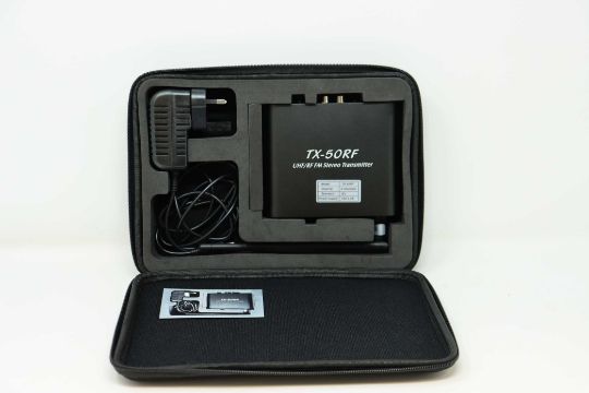 A pre-owned Talent TX-50RF Silent Disco 3 Channel Transmitter with power supply in carry case.