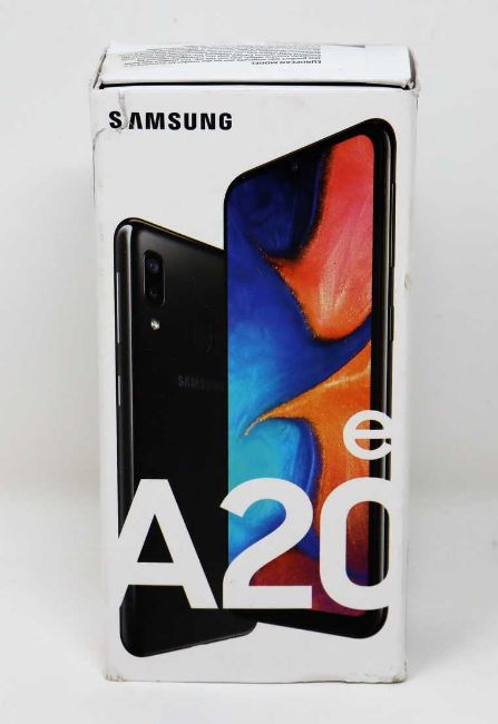 A boxed as new Samsung Galaxy A20E SM-A202F/DS 32GB in Black (Checkmend report ID: CM16701128-C1A0B) (Packaging states 'European Model') (Box opened, some damage to box).